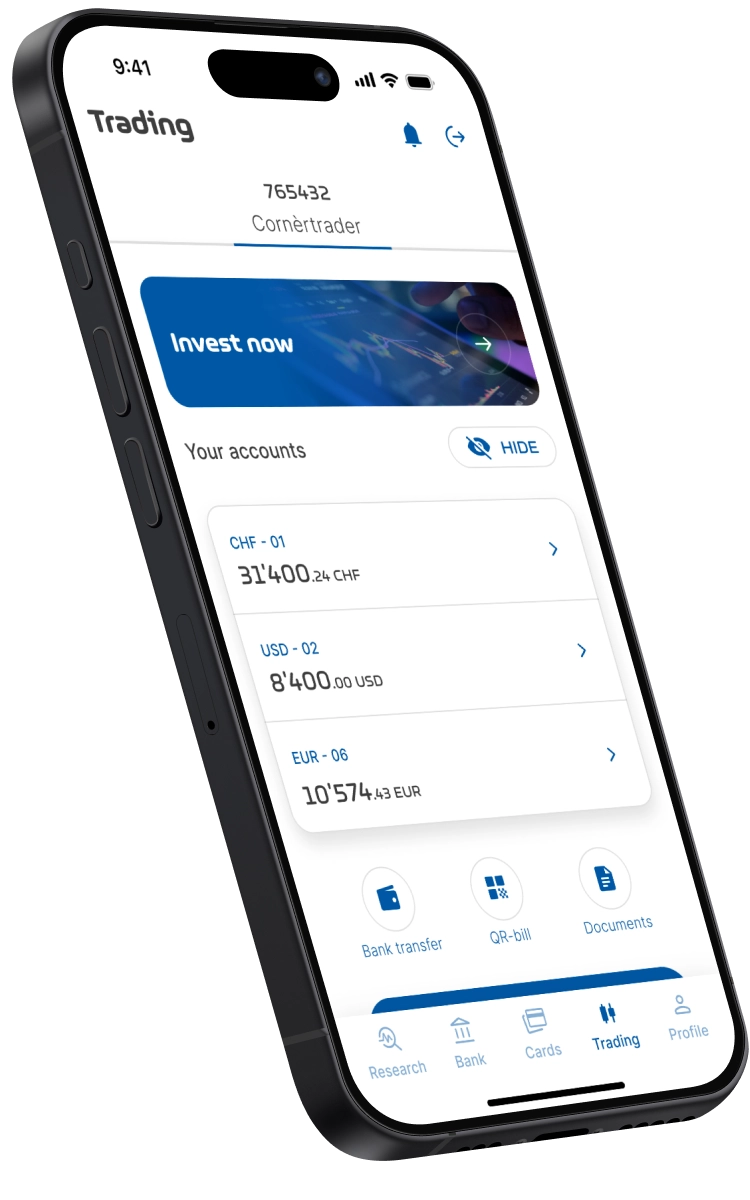 Track market trends and don’t let any opportunities pass you by. In our app, you will find analyses of more than 10,000 instruments and reports prepared by Cornèr Bank analysts team.